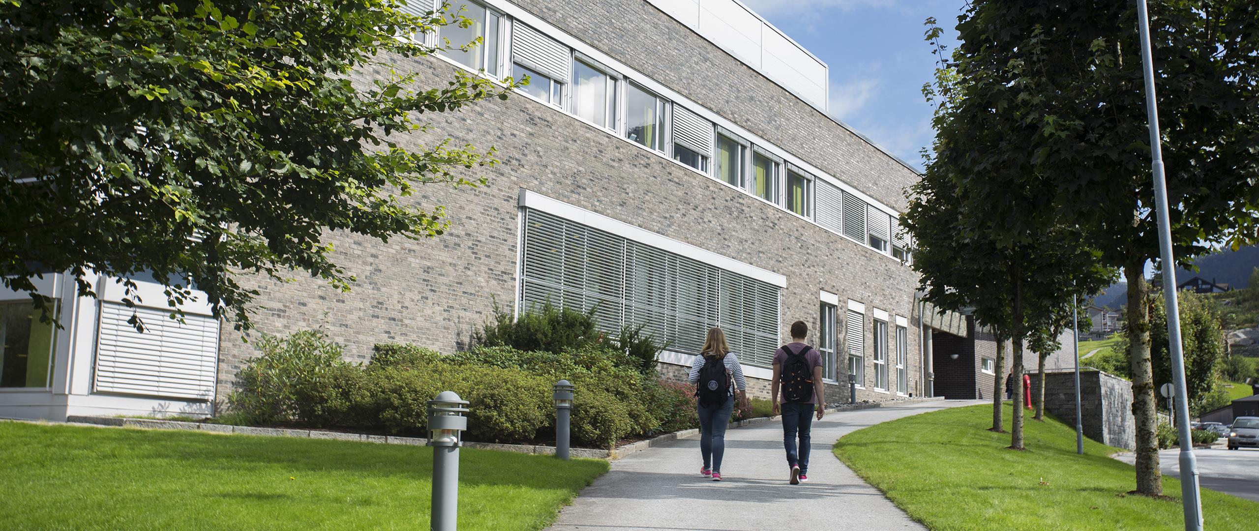 Høyskolebygget ligger 3 km fra sentrum, like ved Førde sentralsjukehus.