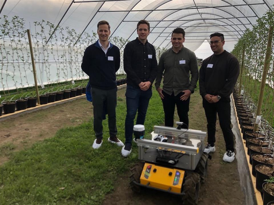 I ein høg, vid plasttunnel med lange bringebærplanter langs ytterkantane, ventar ein robust, liten robot med gult skrog og røffe dekk lydig på klarsignal. Husky sine tre spente fedrar er bachelorstudentane Isak Vamråk Førde, Aril Torheim og Chris Louis Johnsen, som studerer automasjon i Bergen. Det er dei som har programmert Husky og dressert han til å bevege seg nedover langs radene av slanke bringebærskot, snu og krysse over til den andre sida av dyrkingstunnelen, der han igjen tek seg oppover seg langs radene.