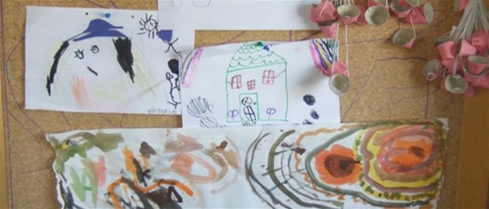 Barneteikningar på veggen i norske barnehagar. Foto: Åsta Birkeland/HVL