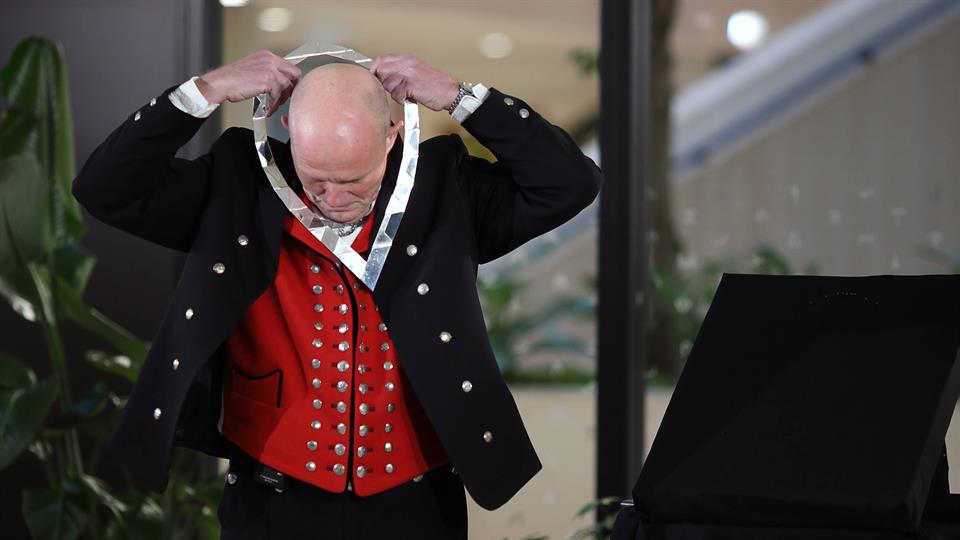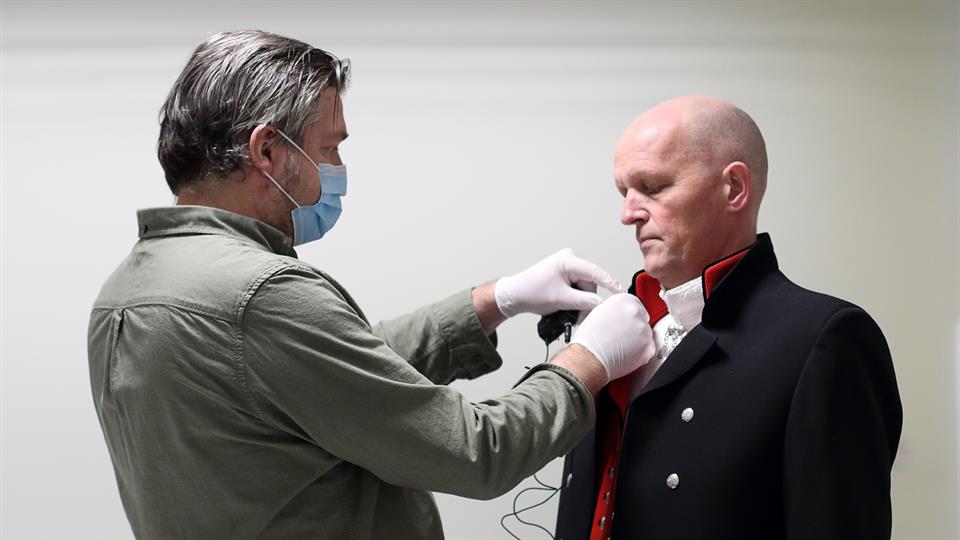 Yttri klargjøres til digital seremoni. Mikrofon festes av produksjonsansvarlig Brian Holmedal, HVL.