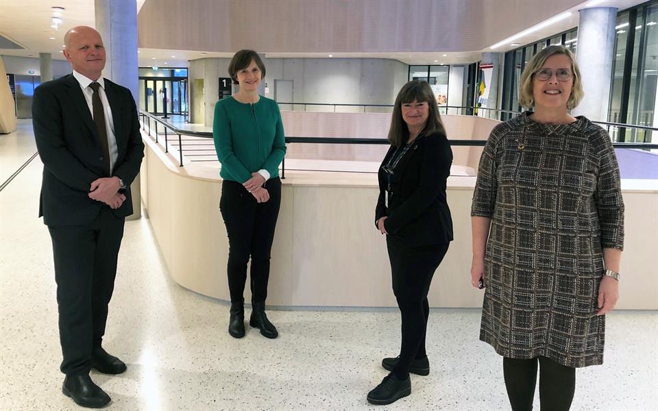 Rektor Gunnar Yttri, barne- og familieminister Kjersti Toppe, prodekan for samhandling Monica Wammen Nortvedt og instituttleder Svanaug Fjær.
