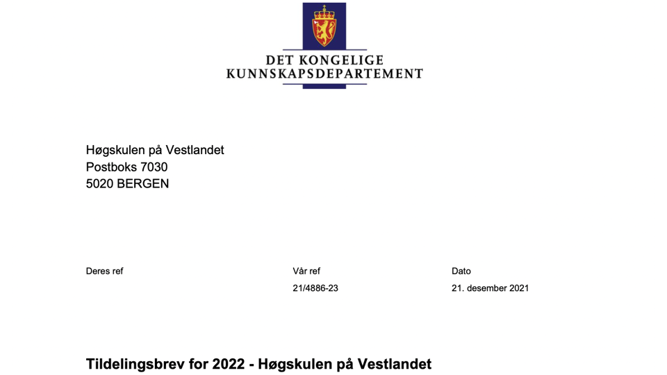 Stortinget vedtok budsjettet for kunnskapssektoren like før jul og HVL mottok tildelingbrevet frå Kunnskapsdepartementet (KD) like etter. Her tildeler KD høgskulen ei rammeløyving på over 2,2 milliardar kroner. Løyvinga vert kombinert med styringssignal, mål og føringar, ikkje berre for 2022, men også for komande år.