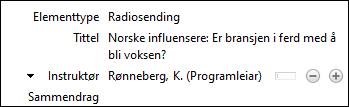 OBS! Etter siste Instruktør (etter fornamn) legg du inn eit mellomrom og (Programleiar/ar) eller (Programleder/e). Da vil du få med denne opplysinga i litteraturlista.