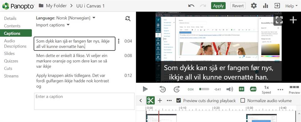 Tip! Remember that when someone watches your video without sound, they cannot hear what is being said. It is therefore important to check for major errors in the automatic captions in order not to be misinterpreted. If you discover a mistake, you can easily edit the text directly in Panopto when you are in editing mode. See the next section if you wonder how.