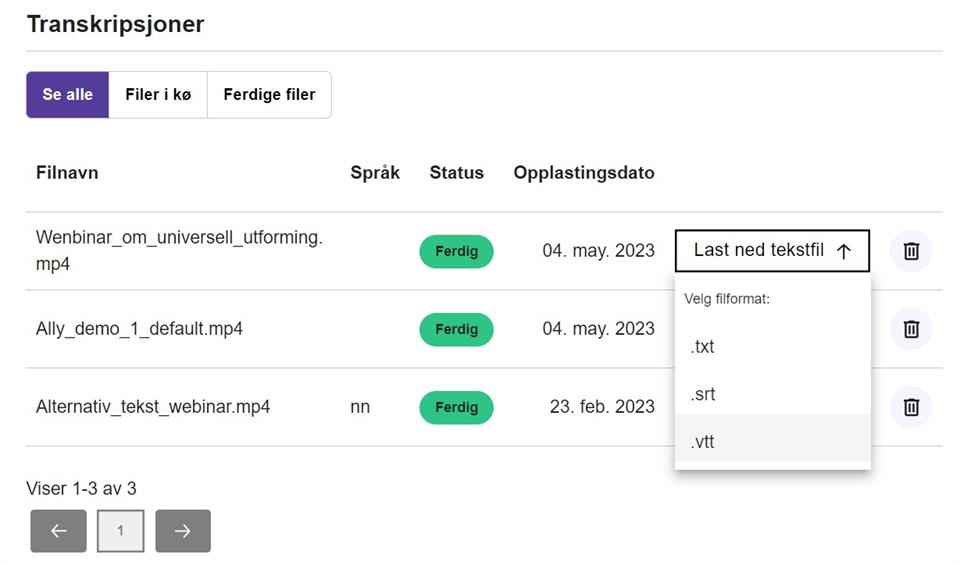 - The transcription and the process will end up in the list of your transcriptions further down the page. When it is finished, you can press "Download textfile". Pick the ".VTT" format.