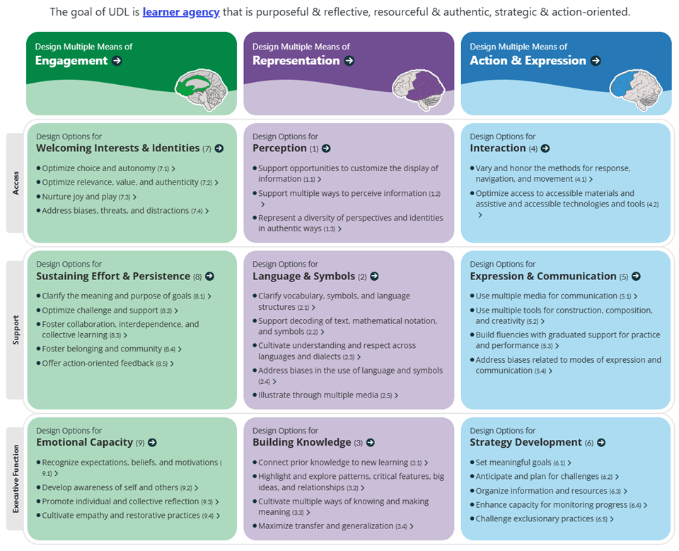 Universal Design for Learning (UDL) is an educational framework that aims to create inclusive learning environments for all by minimizing barriers and providing multiple means of engagement, representation, and action and expression. The goal of UDL is learner agency that is purposeful and reflective, resourceful and authentic, strategic and action oriented. The UDL guidelines have been developed to support implementation of UDL over the last two decades with the lates version of the guidelines released in 2024 (see graphic organizer below) and represent the bases for this guide. Scroll to the bottom of the page to download the guide in English or Norwegian.