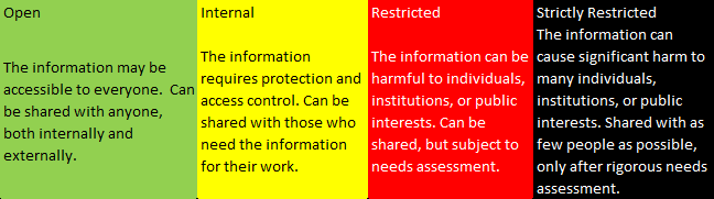 Classification is an important tool for ensuring proper storage and handling of information. All information/data should be classified into one of the four categories: Open (green), Internal (yellow), Restricted (red), or Strictly Restricted (black), with corresponding color coding to facilitate overview.