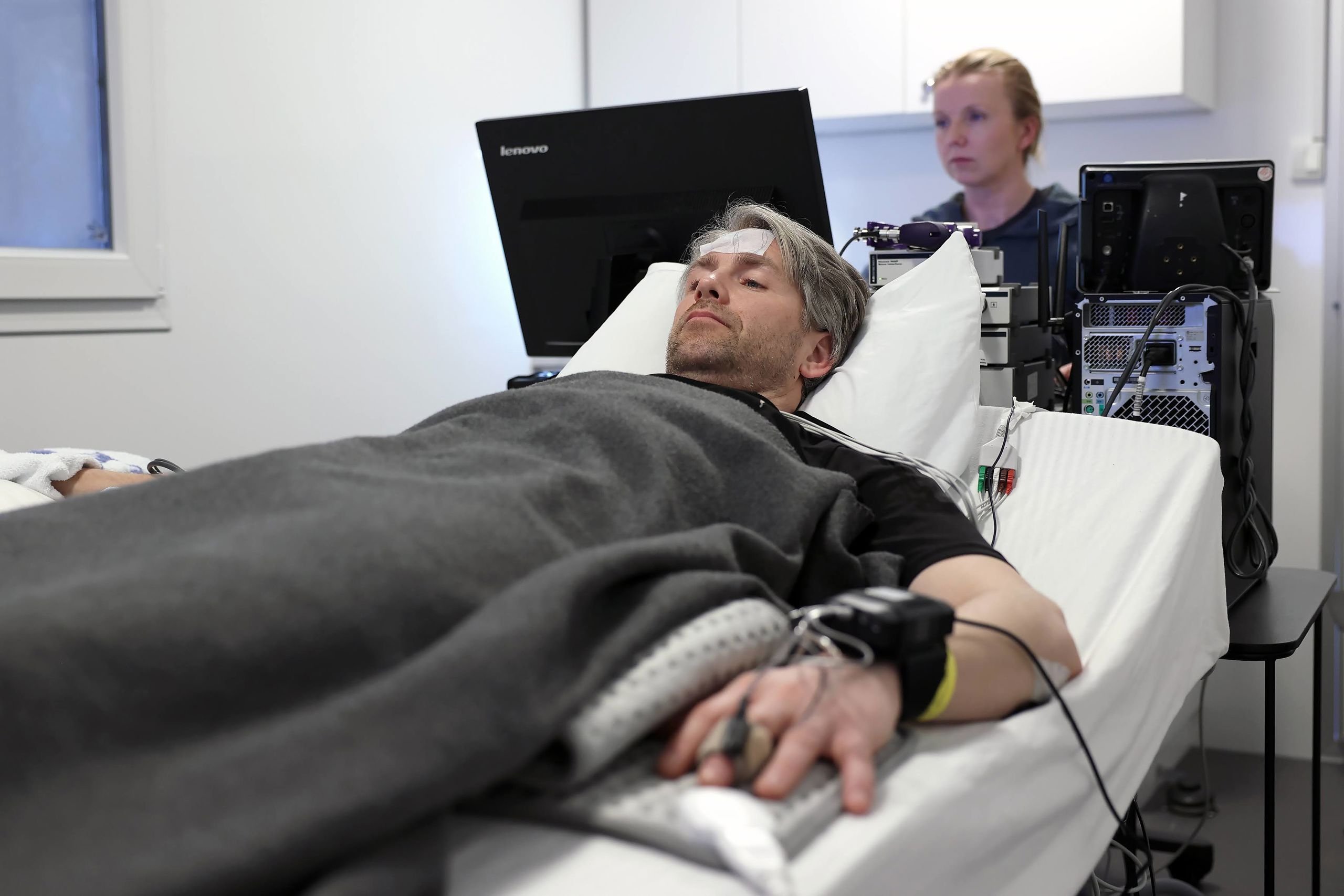 With electrodes attached from head to toe, he spent one minute in the cold water. Now, ten minutes in the sauna await before he must return into the water once more.