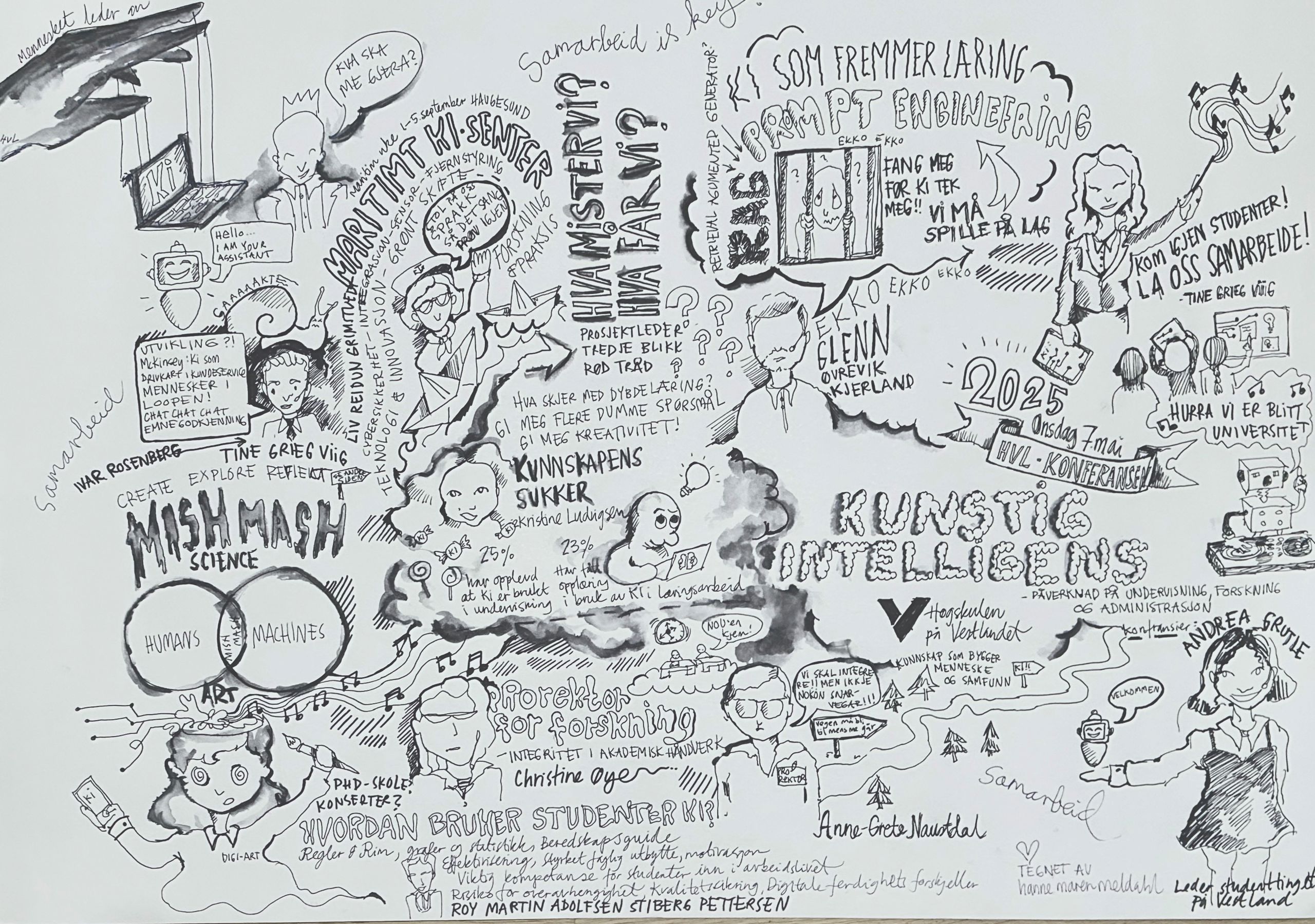 Toppbildet på konferansesida er bytta ut med Hanne Maren Meldahl sitt visuelle referat av HVL-konferansen 2025.
