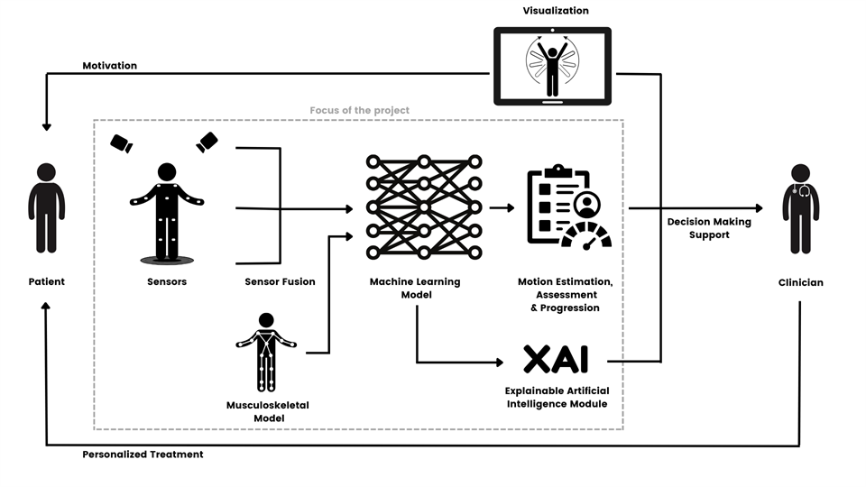 Det primære målet med prosjektet er å utvikle et automatisert system for estimering og vurdering av menneskelig bevegelse, spesielt skreddersydd for rehabilitering av slagpasienter. Dette systemet vil integrere data fra en rekke sensorer, ved hjelp av en datafusjonstilnærming og en muskel- og skjelettmodell for å generere omfattende bevegelsesestimater. De resulterende estimatene vil bli brukt til å analysere pasientens motoriske funksjon og rehabiliterings fremgang gjennom bruk av ML-algoritmer. En enkel oversikt over det foreslåtte systemet kan sees i fig. 1. Det forventede resultatet av denne forskningen er en ny tilnærming til utvinning og tolkning av bevegelsesdata som vil gi klinikerne innsikt som kan støtte dem i beslutningsprosessen.