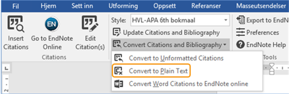Det er mulig å opprette et Word-dokument hvor forbindelsen til EndNote er brutt. Her kan du gjøre siste finpuss i referansene. Dette burde være det siste man gjør før eventuell lagring som PDF-fil eller før å sende dokumentet fra seg. NB: Ta vare på det opprinnelige dokumentet, der EndNote-kodene er intakt.