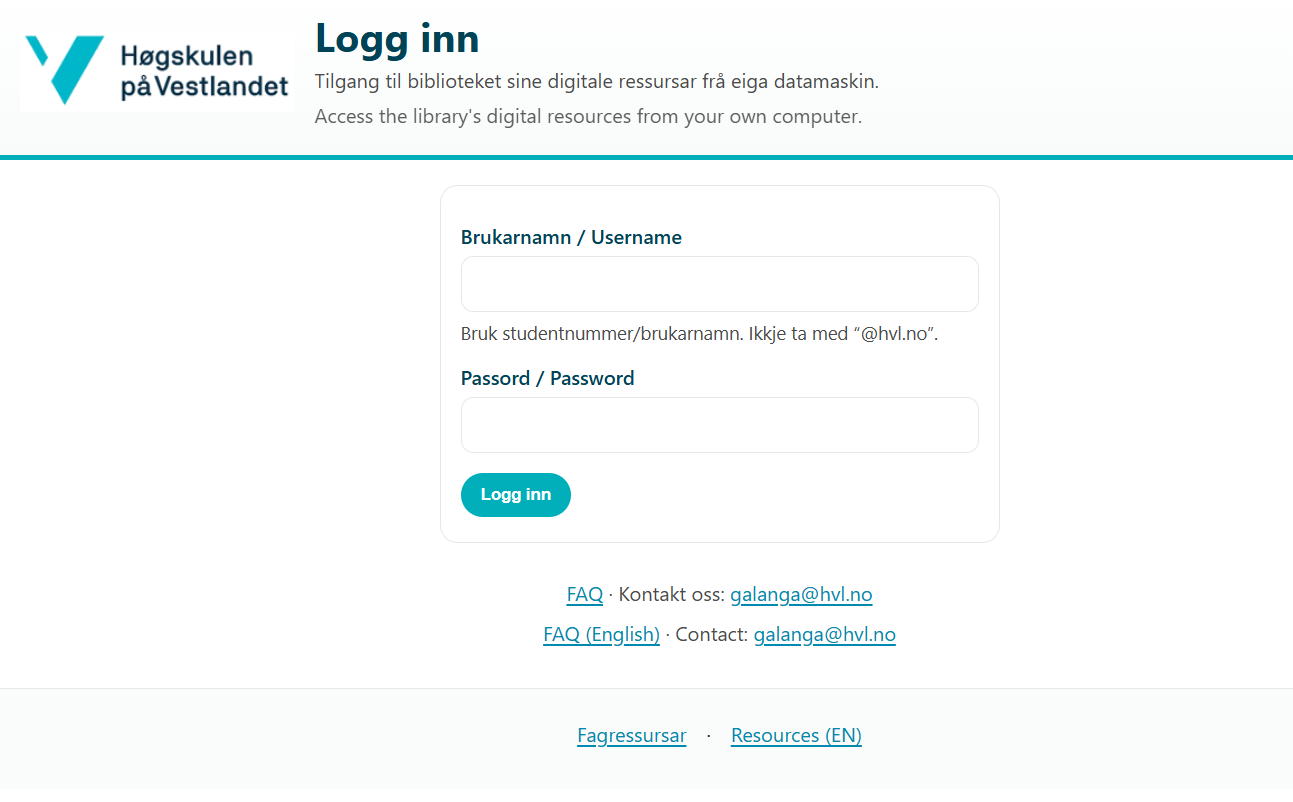 Studentar og tilsette ved HVL får tilgang med sitt HVL-brukarnamn (utan "@hvl.no") og passord. Etter at du har logga på, blir du sendt vidare til ressursen/artikkelen, og får samstundes tilgang til alle andre ressursar biblioteket abonnerer på.