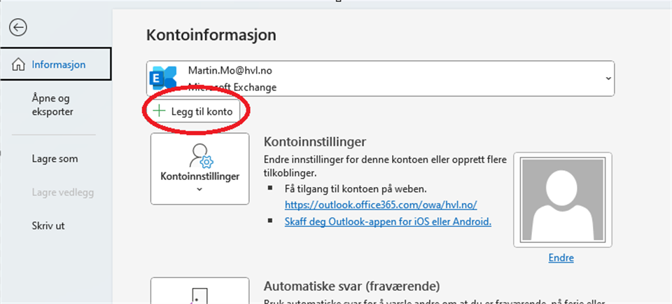 - Under Kontoinformasjon og Kontoinnstillinger, finn du «Automatiske svar (fraværende).» Trykk deg inn på denne.
