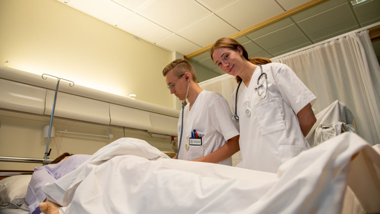 For å utvikle praktiske ferdigheiter og øve på realistiske situasjonar, er rettleia ferdigheitstrening ein sentral del av alle tre åra. Denne ferdighetstreninga skjer i SimArena, som er eit moderne og velutstyrt simuleringssenter for alle studentane.