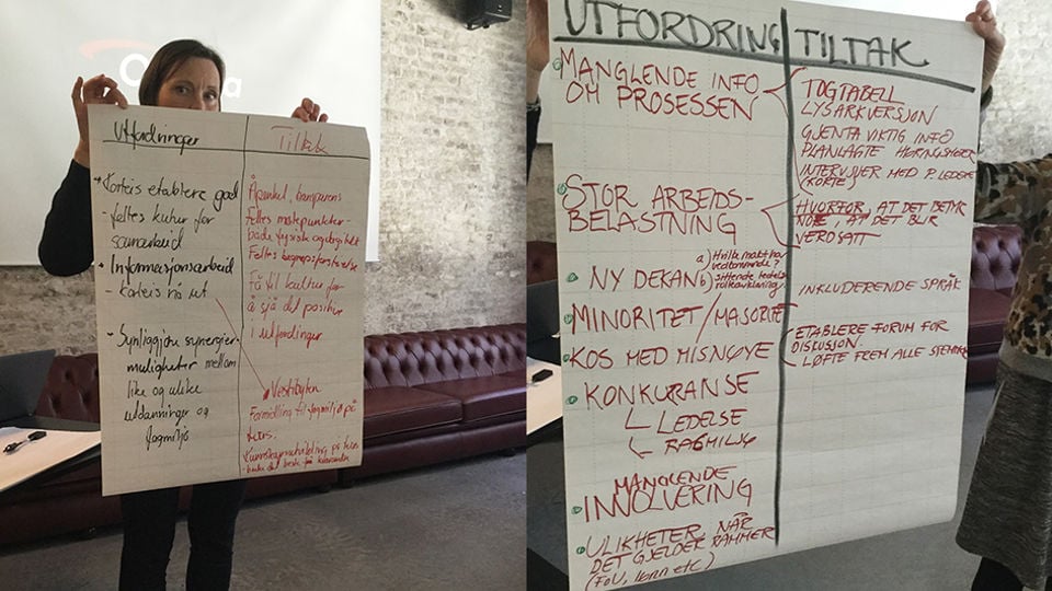 – Vi har eigentleg venta litt på å kome skikkeleg i gang, og ser det no som ein styrke at OU-teamet er på plass og at ein kan få hjelp og støtte der til å jobbe vidare. Elles var det god og kreativ stemning på møtet 28. mars, og leiarane kom i fellesskap fram til prosessen vidare, fortel dekanane for dei fire avdelingane.