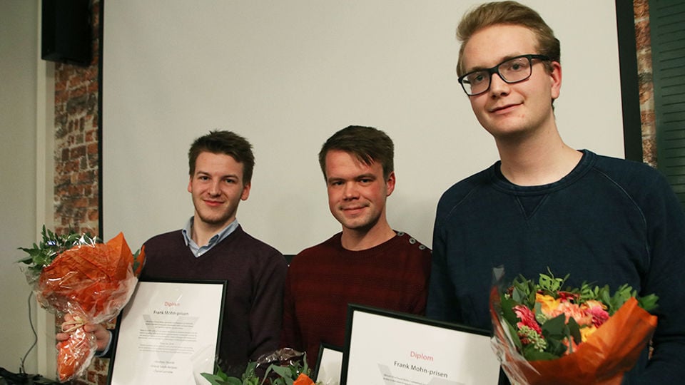 Frank Mohn AS deler kvart år ut ein pris til studentar som har vist spesielt god innsikt og evne til kreativitet. Årets pris går til ei gruppe studentar ved Institutt for maskin- og marinfag. Dei har sette seg inn i kompliserte teoretiske algoritmar, konstruert og bygga ein fysisk testrigg, og programmert ein simuleringsalgoritme i Java. Vinnarane er Andreas Skjelde, Erlend Sande Bergaas og Daniel Leinebø for bacheloroppgåva "Assessment of friction in a real-world model Using the Moving Frame Method in Dynamics". Rettleiar er Thomas J. Impelluso ved Institutt for maskin og marinfag.