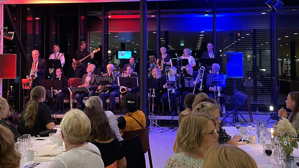 Feststemning under konserten med Sogndal Storband i kantina ved Høgskulen på Vestlandet, campus Sogndal.