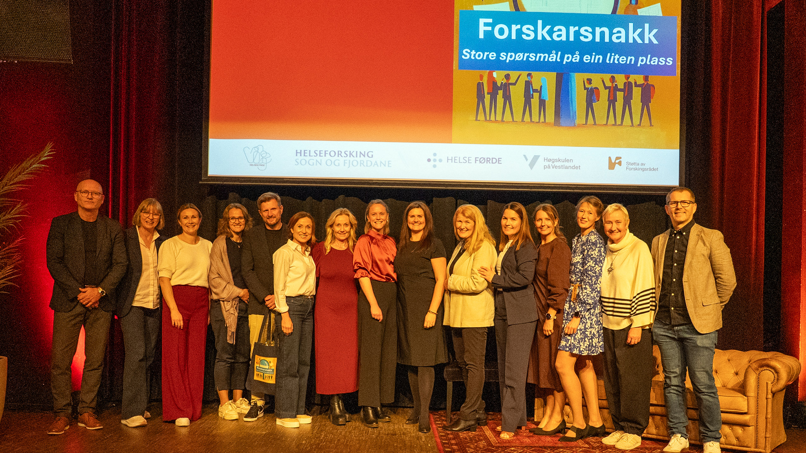 Forskarsnakk live: Forskarsnakk er ein podkast skapt av stipendiatmiljøet i Førde, og kombinerer forskarar frå både HVL og Helse Førde. Dei arrangerte ein festkveld på Larris scene på Sunnfjord hotell, med musikk, mat og underhaldande formidling av forsking, hovudsakleg frå stipendiatane. Arve Uglum, ny kommunikasjonsdirektør i Helse Førde, var programleiar.