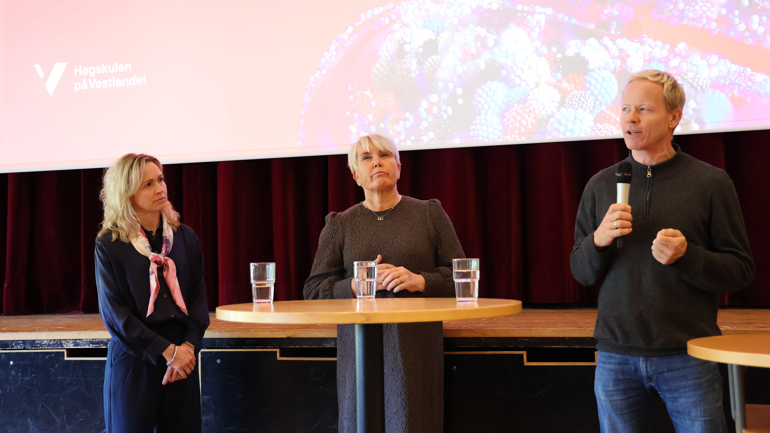 Aula på campus Stord var fullsatt under seminaret ”Robuste barn, diagnosefellen og lek: Veien til et inkluderende samfunn for barn og unge”. Her er psykologspesialist Line Marie Warholm i samtale med førstelektor Sissel Jeanette Aastvedt Halland og høgskolelektor Heine Tønnesen Vestvik.
