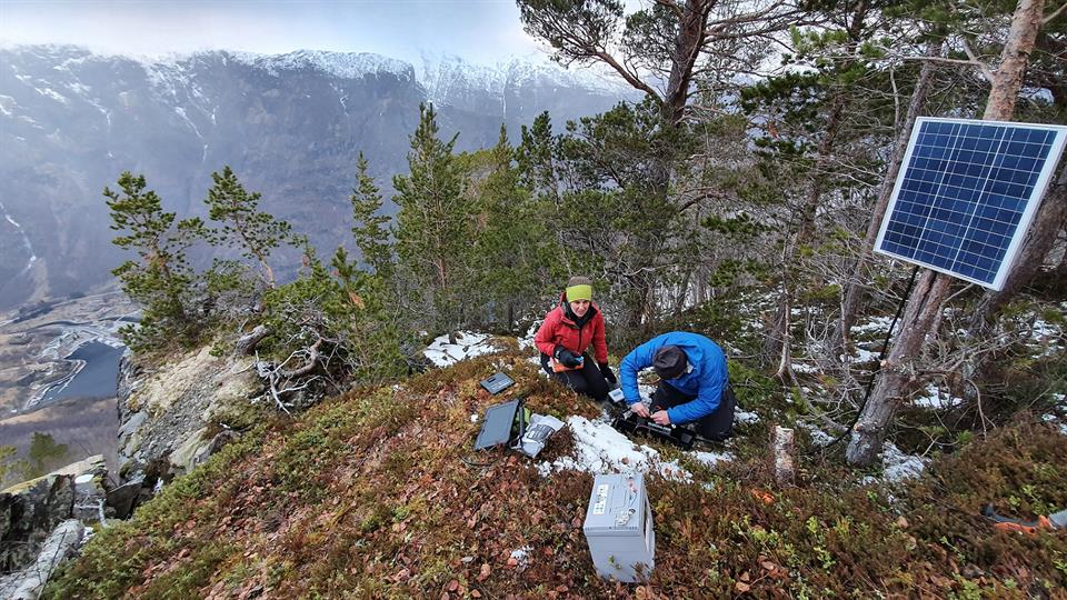 Stampa-området i Aurland. Her installerer Paula Snook og Sigurd Nerhus (HVL) ein såkalla geofon, ein seismisk sensor som registrerer rørsle i fjellet. (Foto: HVL).