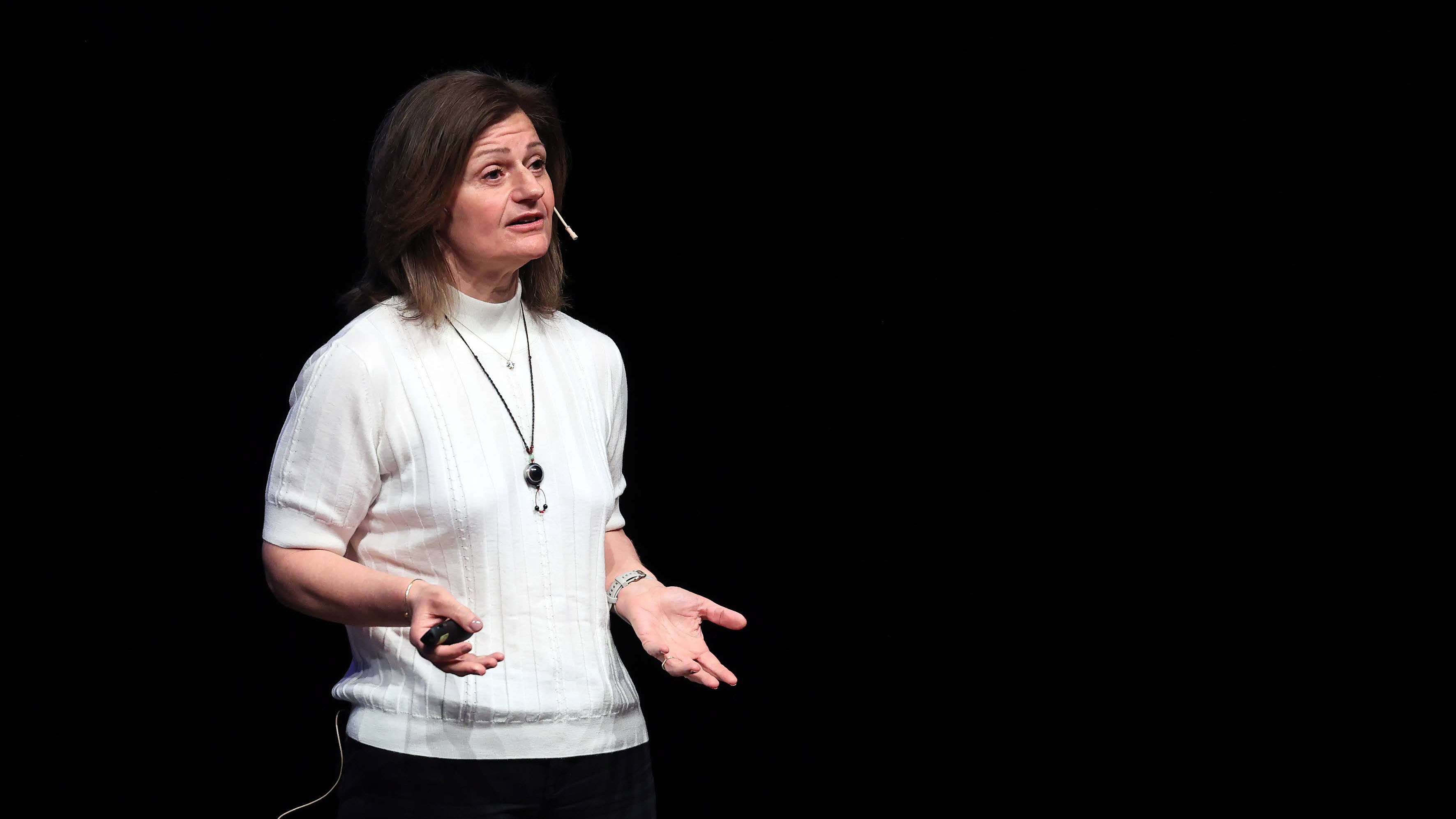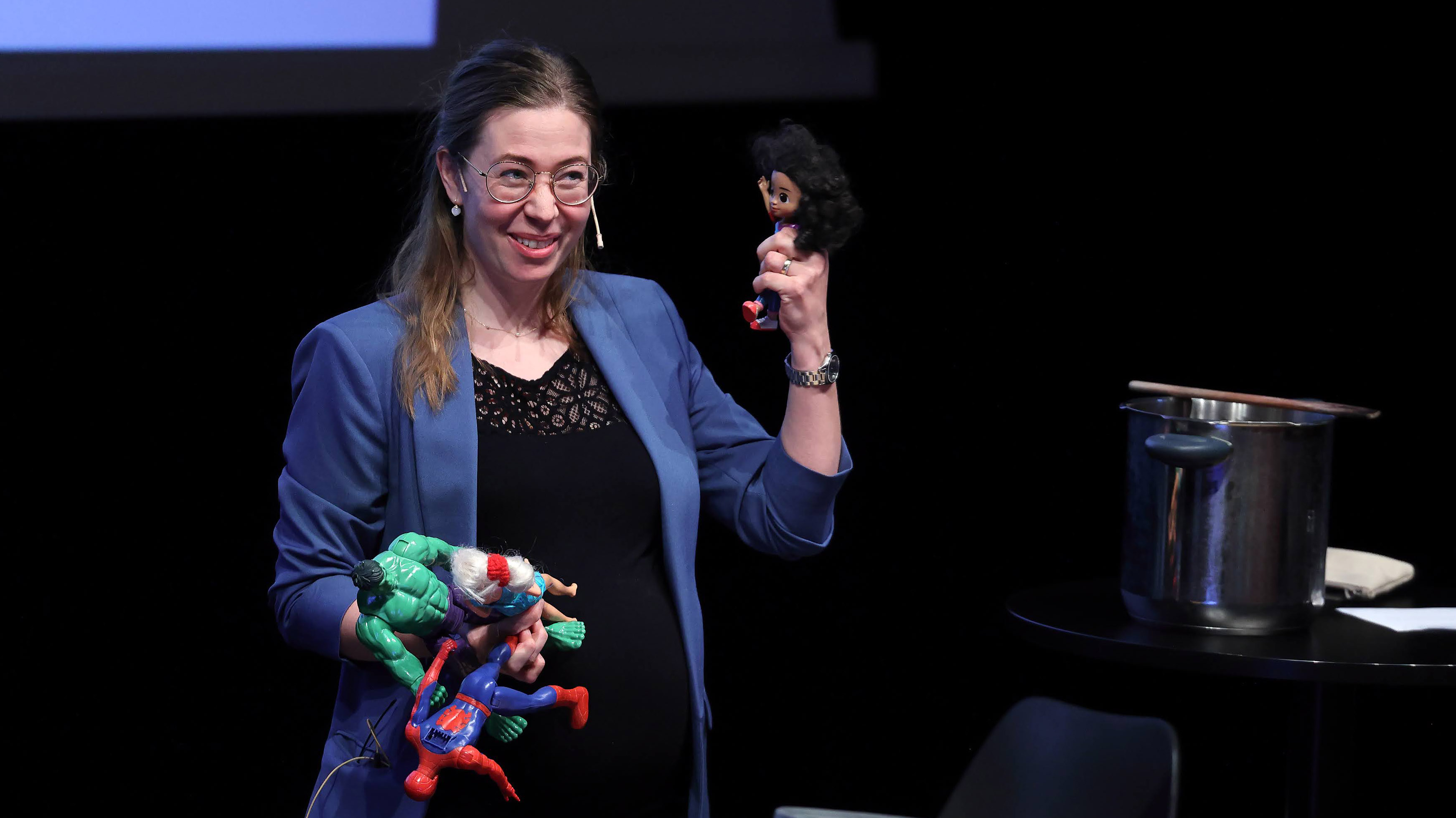 Kine Melfald Tveten hadde rekvisittar med på scenen då ho presenterte forskingsprosjektet MoveEarly.
