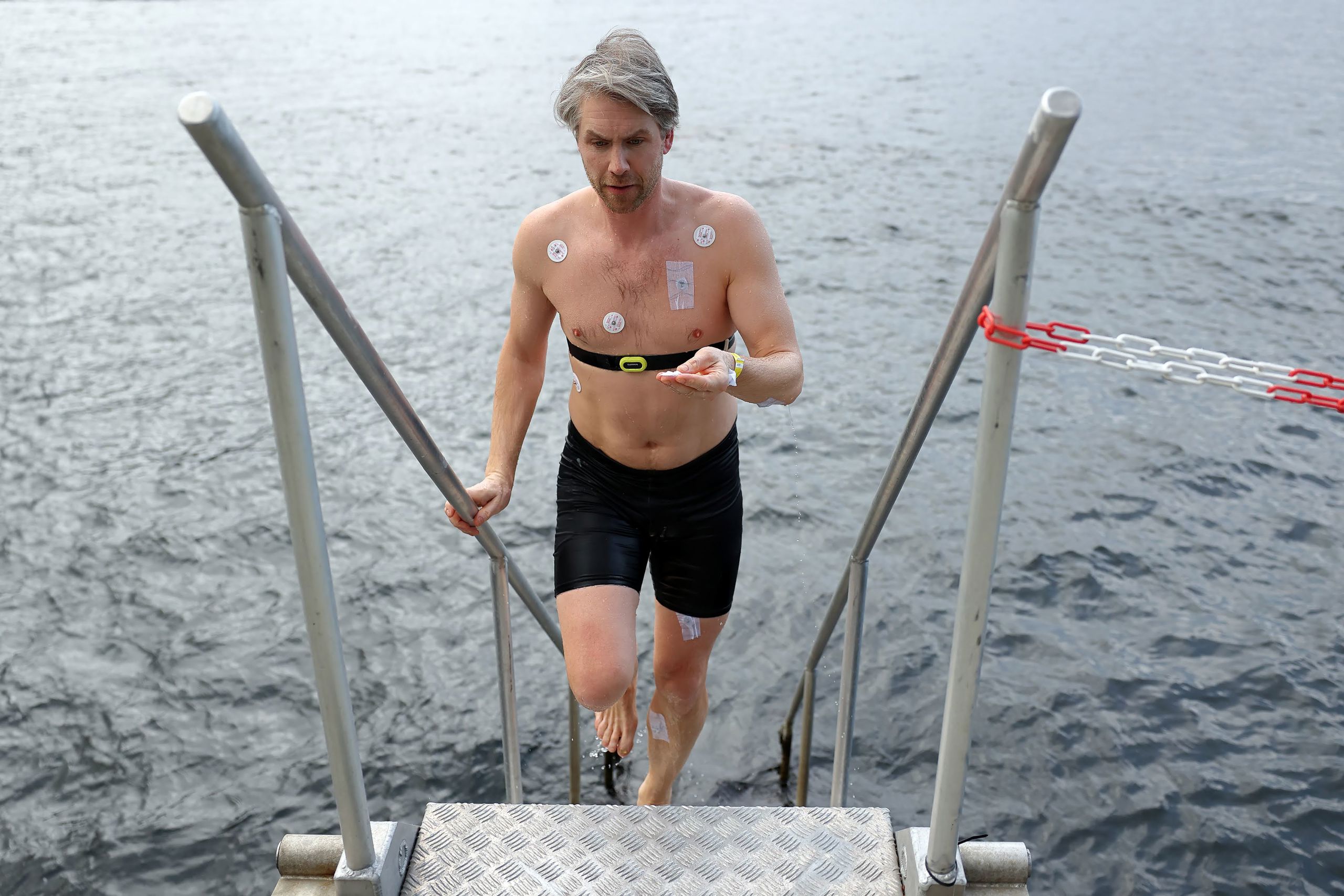 Med elektrodar festa frå topp til tå, har han gjennomført eit minutt i det kalde vatnet. No ventar ti minutt i badstova før han må ut i ein siste gong.