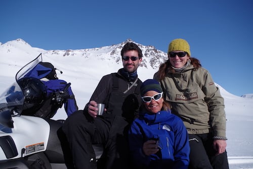 Foto under: Jacob Clement Yde, Marit Svarstad Andresen og Mette Gillespie under feltarbeid på bre.