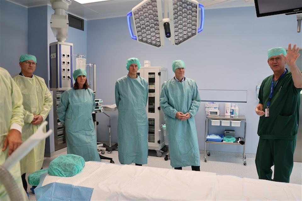 (På bildet: Jenny Følling, Erling Sande og Oddmund Hoel under omvisning på nybygget på Førde sjukehus, under pressekonferansen om Vestlandslegen. Til venstre: Arve Varden, administrerande direktør ved Helse Førde)