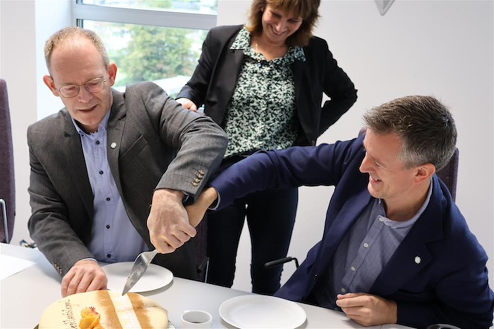 Oddmund Hoel og Erling Sande feirar dei 20 nye studieplassane for legestudentane. I bakgrunnen: Jenny Følling, ordførar i Sunnfjord.