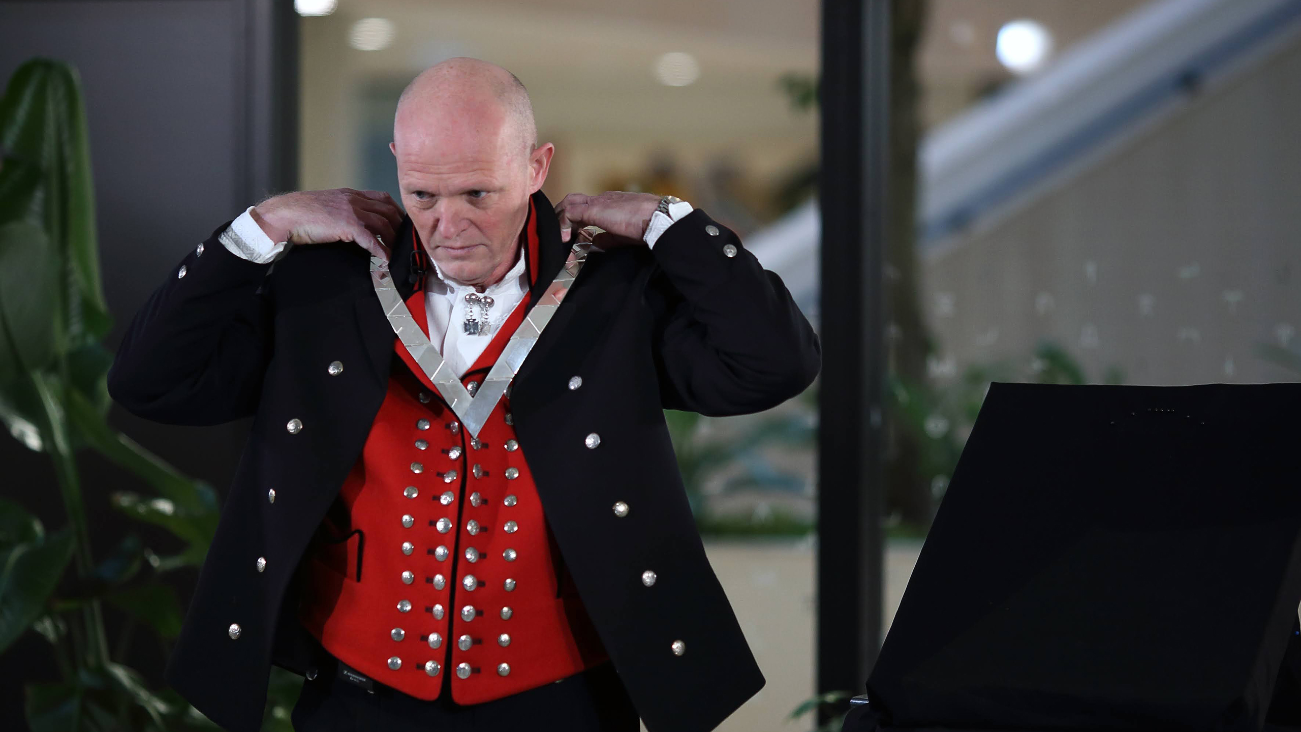 Yttri klargjøres til digital seremoni. Mikrofon festes av produksjonsansvarlig Brian Holmedal, HVL.