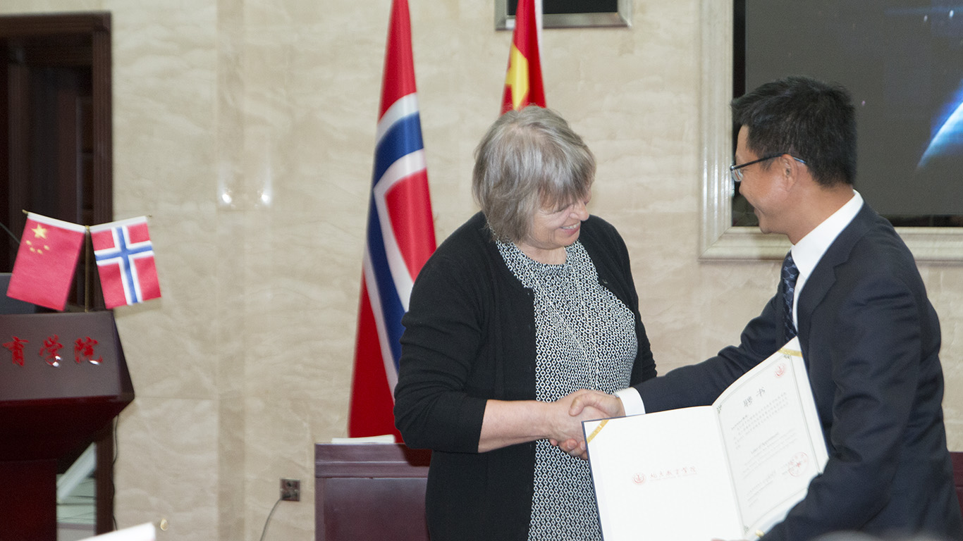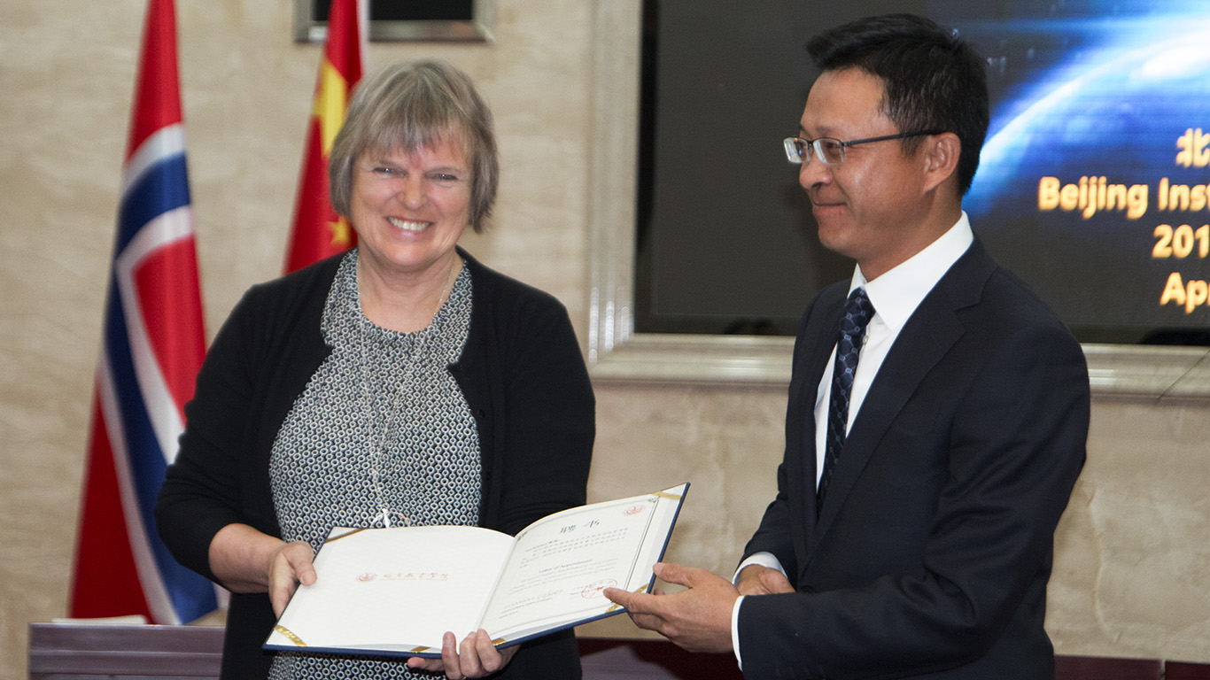 En glad Åsta Birkeland som akkurat har mottatt æresprofessorat fra samarbeidspartner Beijing Institute of Education. Også kollega Siv Ødemotland ble tildelt æresprofessorat ved denne institusjonen.