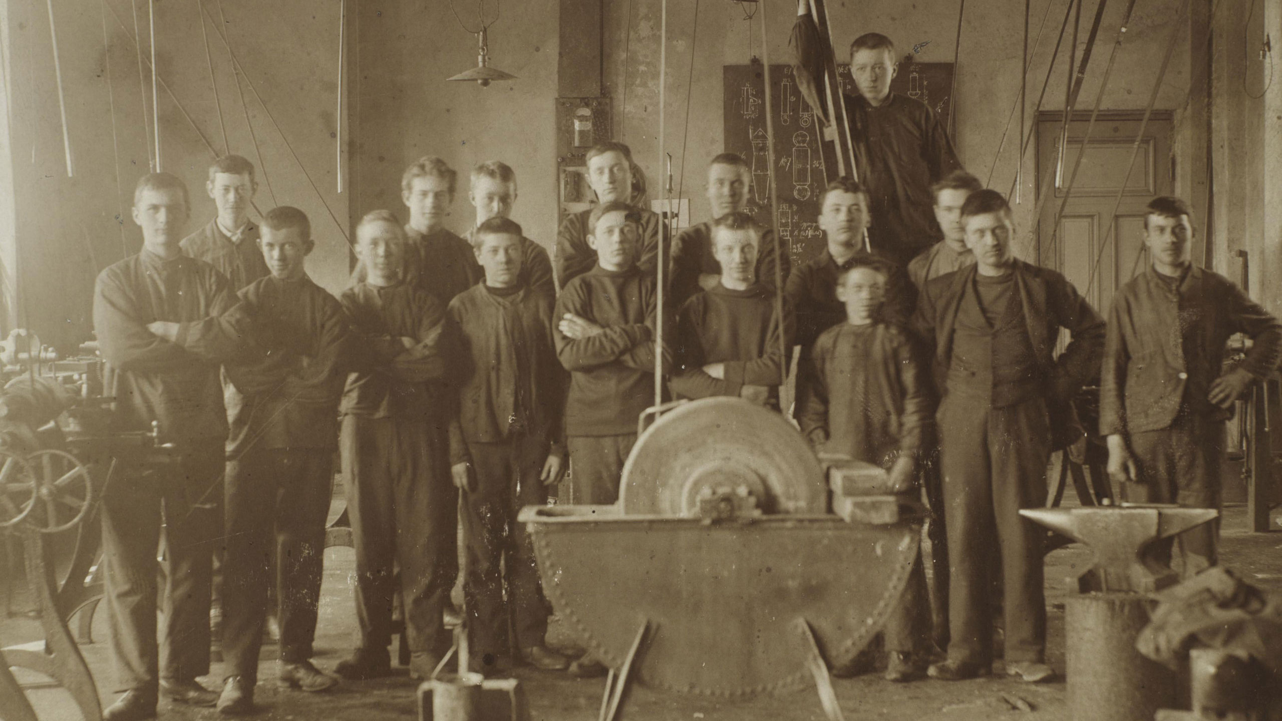 (Foto: Elevar på mekanisk verkstad ved BTS. Tatt mellom 1900 – 1905. Universitetsbiblioteket i Bergen).