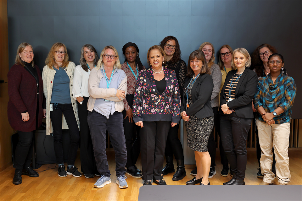 Bilde: Sjefsredaktør i Cochrane, Karla Soares-Weiser (nr. 2 foran fra v.), besøkte nylig HVL. Prodekan for forskning Christine Øye (nr. 1 foran fra v.) og prodekan for samhandling Monica Wammen Nortvedt (nr. 3 foran fra v.) deltok også under besøket sammen med en større delegasjon fra HVL.