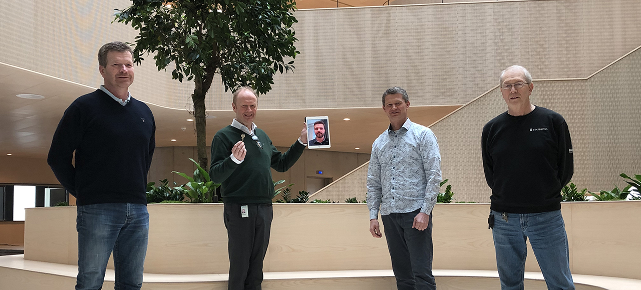 Stolte prosjektledere, fra venstre: Terje Viken (distriktssjef Kruse Smith), Knut Kismul (prosjektleder HVL), Audun Nygard (prosjektleder Kruse Smith) og Ulf-Åge Olseth (driftsleder Statsbygg). Tilstede på video: Lars Christian Gomnæs (prosjektleder Statsbygg).