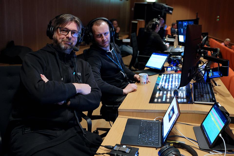 Medielab var i kulissane for heile konferansen. Her jobbar Ferruccio Goia og Brian Holmedal for å sikre at strauminga og det tekniske går som det skal.
