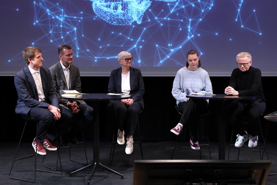 Panelsamtalen leia av Jobjørn Myren frå Studenttinget. Deltakarar frå venstre Alexander S. Lundervold (førsteamanuensis ved Institutt for datateknologi, elektroteknologi og realfag), Sverre Simen Hov (næringspolitisk rådgiver i Bergen næringsråd), Anne-Grethe Naustdal (prorektor for utdanning ved HVL), Josefine Franck-Ring (student) og Wiggo Hustad (avdelingsleder for organisasjonsutvikling og digitalisering ved HVL).