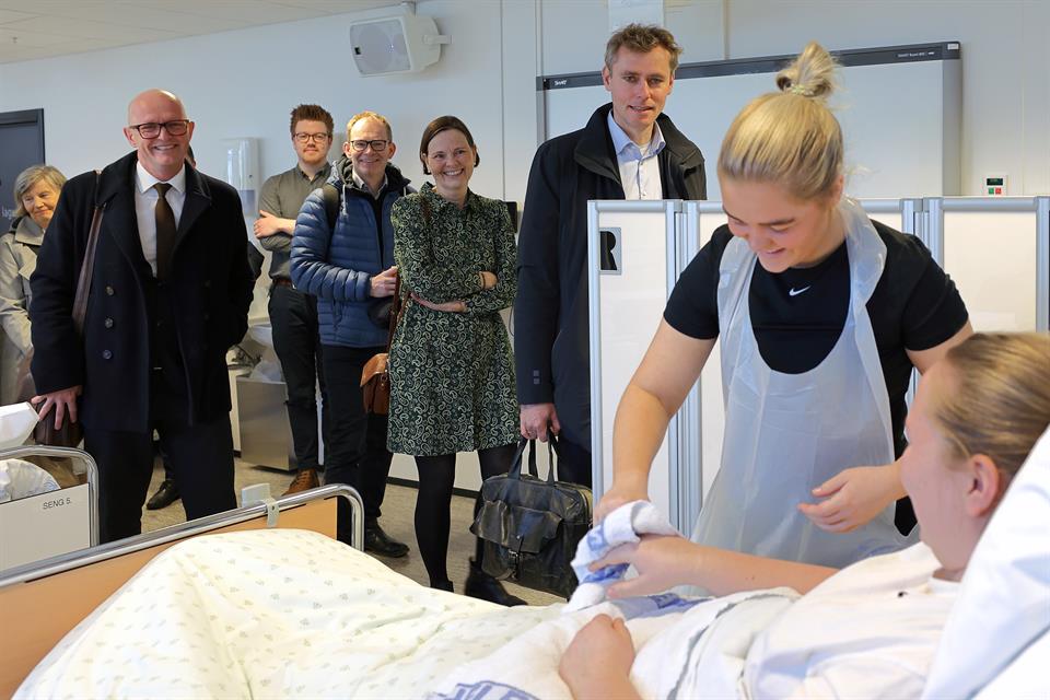 Bilete: Følgje med statsråden og rektor fekk også sjå vernepleiarstudentar i aksjon på SIM Arena.