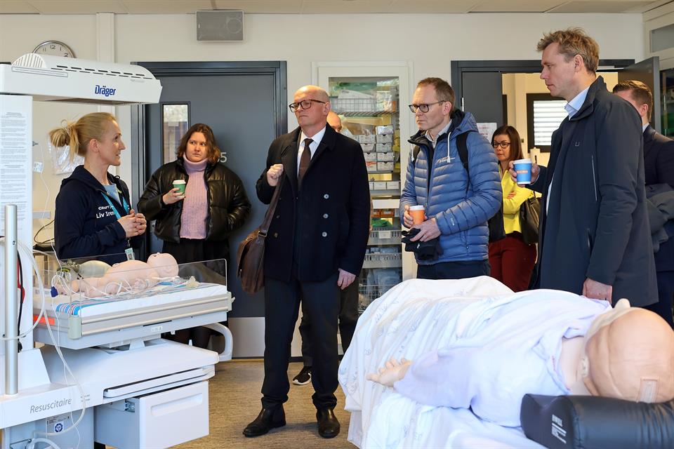 Bilete: Statsråden og rektor fekk og ei omvisning på SIM Arena som er simulerings- og ferdigheitslabbar der studentane får øve seg på det som møter dei i arbeidslivet. HVL har slike labbar på alle fem campus.