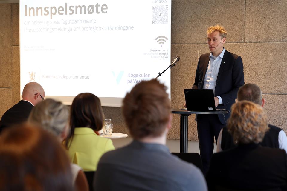 Bilete: Statsråd Ola Borten Moe opna innspelsmøte på Høgskulen på Vestlandet om helse- og sosialfagutdanningar i samband med ny Stortingsmelding om profesjonsutdanningane.