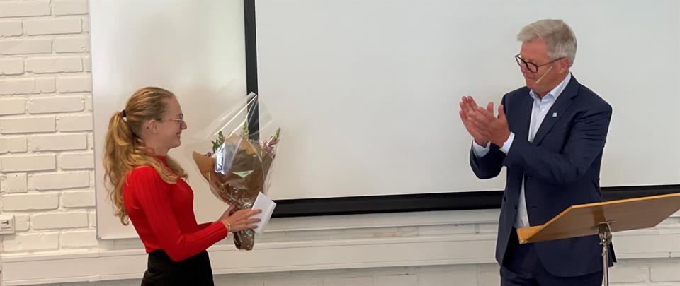 Jorunn Simonsen Thingnes får blomar frå dekan Asle Holthe under ei markering på FLKI.