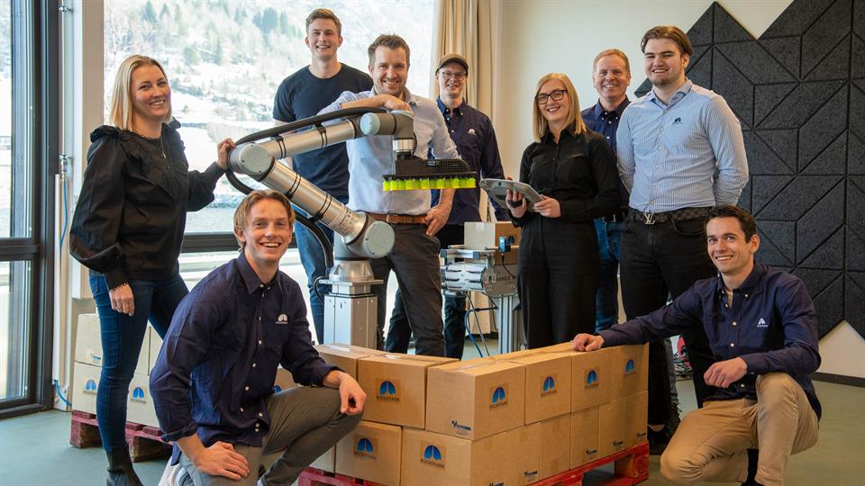 Gjennom praksisopphaldet får HVL-kandidatane verdifull innsikt i arbeidslivet. Her er fire studentar saman med fleire kollegaer frå Rocketfarm og robot-palleteringsløysinga Pally, som blir selt globalt frå kontoret i Sogndal.