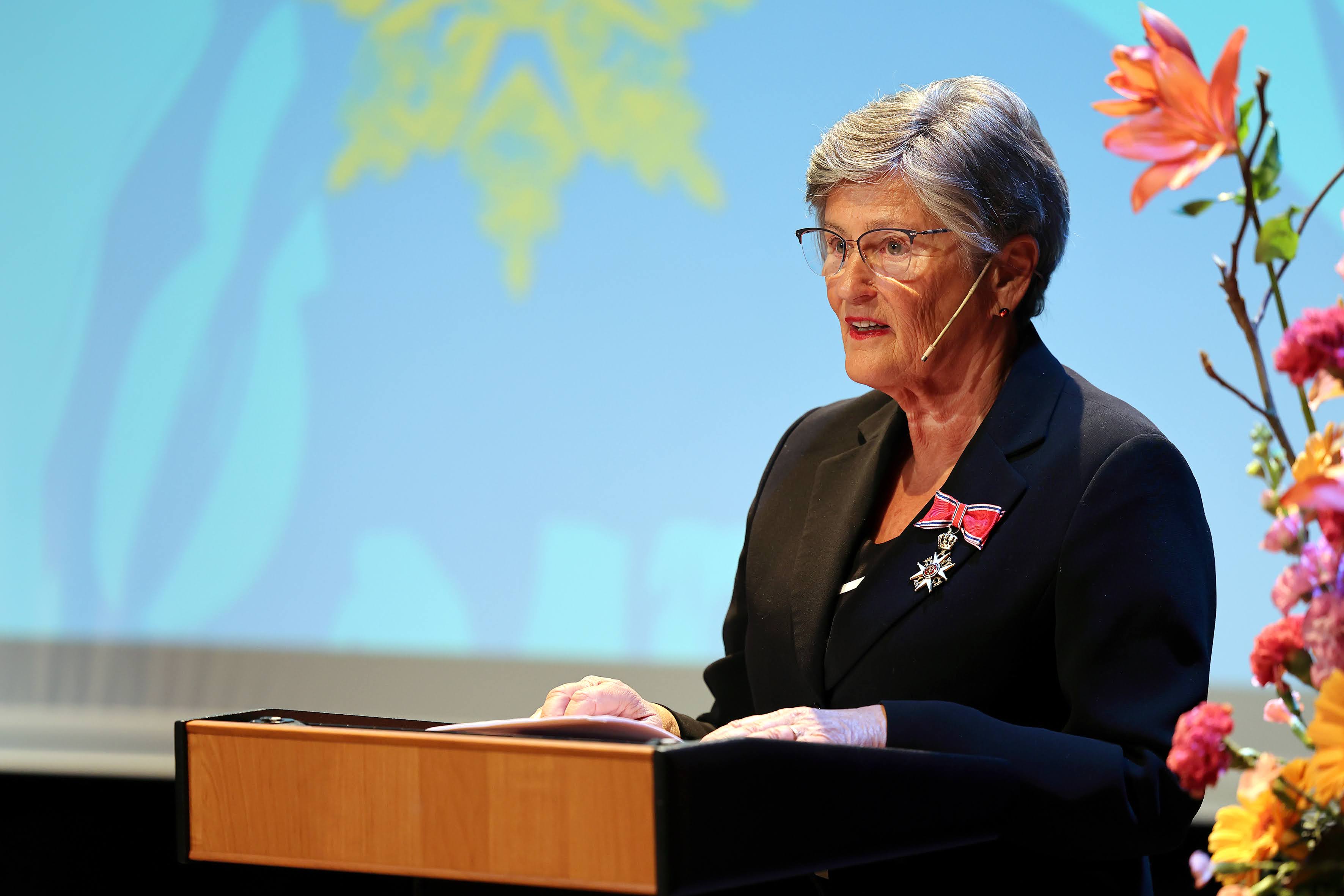 Bilete: Kari Dyregrov under markeringa på Høgskulen på Vestlandet, der ho blei utnemnt til Ridder 1. klasse av den Kongelege Norske St. Olavs Orden.
