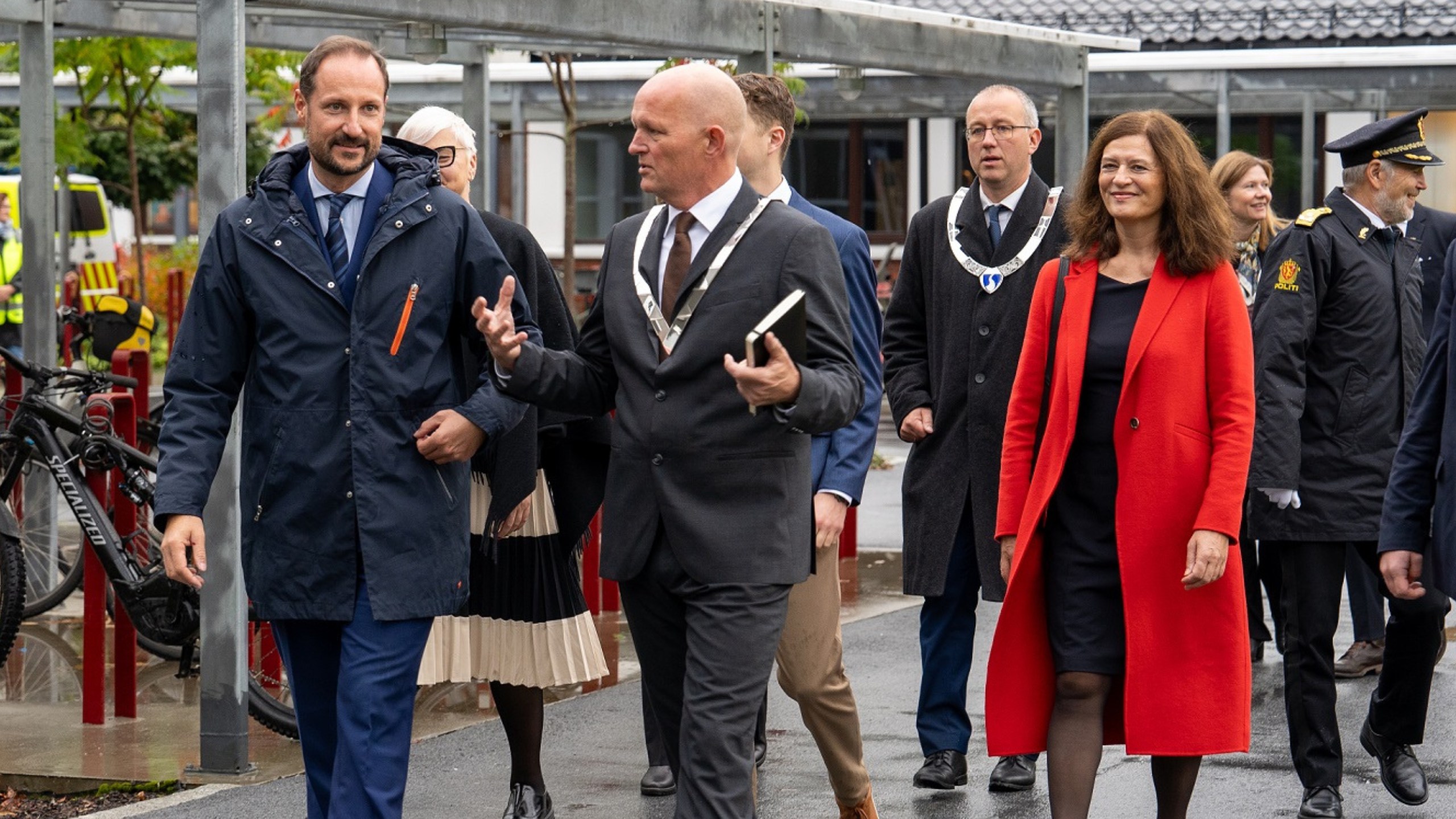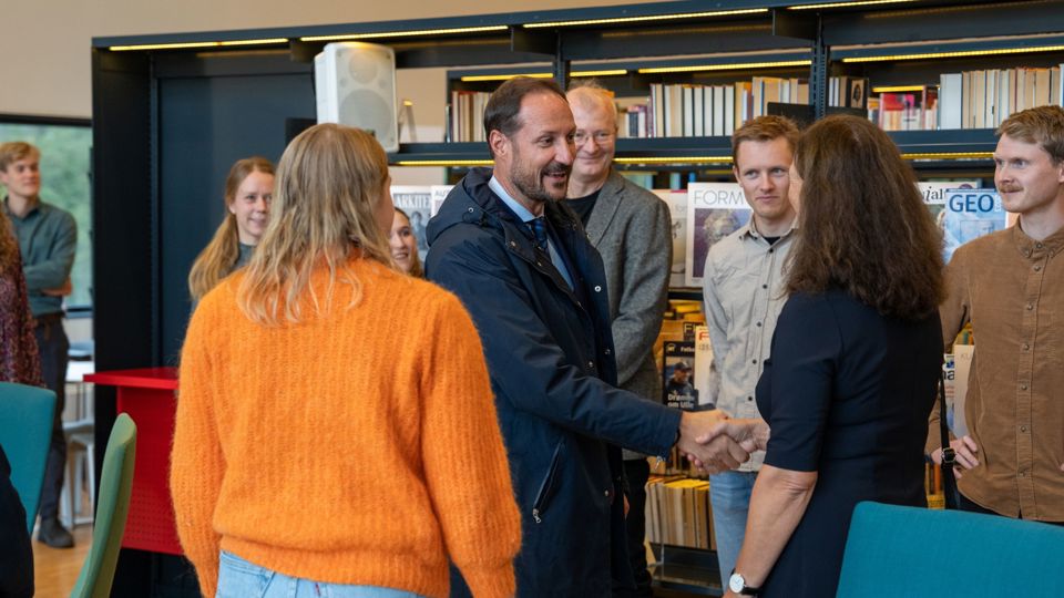 Kronprinsen blei helst velkommen av blant anna rektor Gunnar Yttri og prorektor for utdanning, Anne-Grethe Naustdal. Etter ei omvising på campus der rektor fortalde historia om høgskulen, blei kronprinsen invitert med inn i biblioteket.
