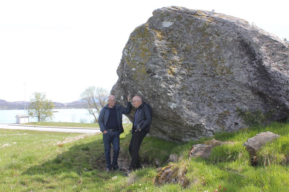 Forskarane Nils Tore Økland og Bjørn Bjørlykke har samla dei ulike forteljingane om steinen, saman med 2000 andre segner. (Foto: Hilde Zwaig Kolstad / HVL)
