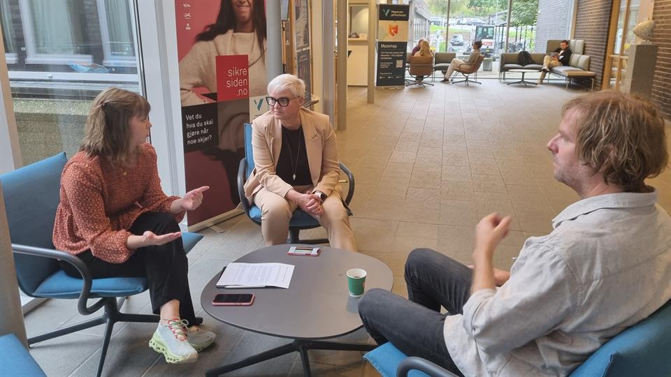 Anne-Grethe Naustdal, prorektor for utdanning, i samtale under Læringsmiljøutvalet sitt heldagsseminar på campus Førde.