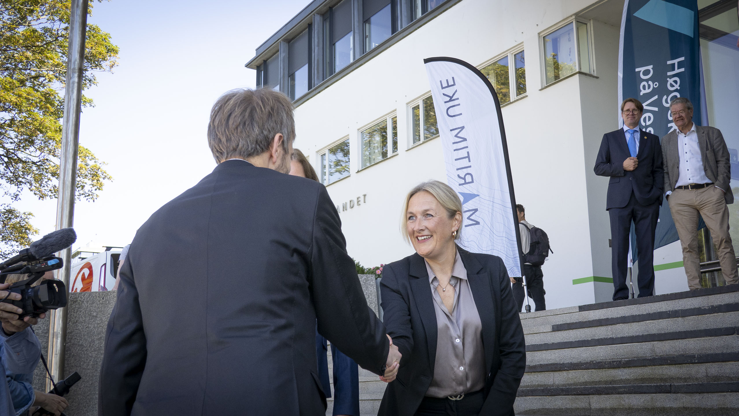 Dekan Else Cathrine L. Rustad tok imot helse- og omsorgsminster Jan Christian Vestre då han besøkte campus Haugesund. Foto: Terje Rudi