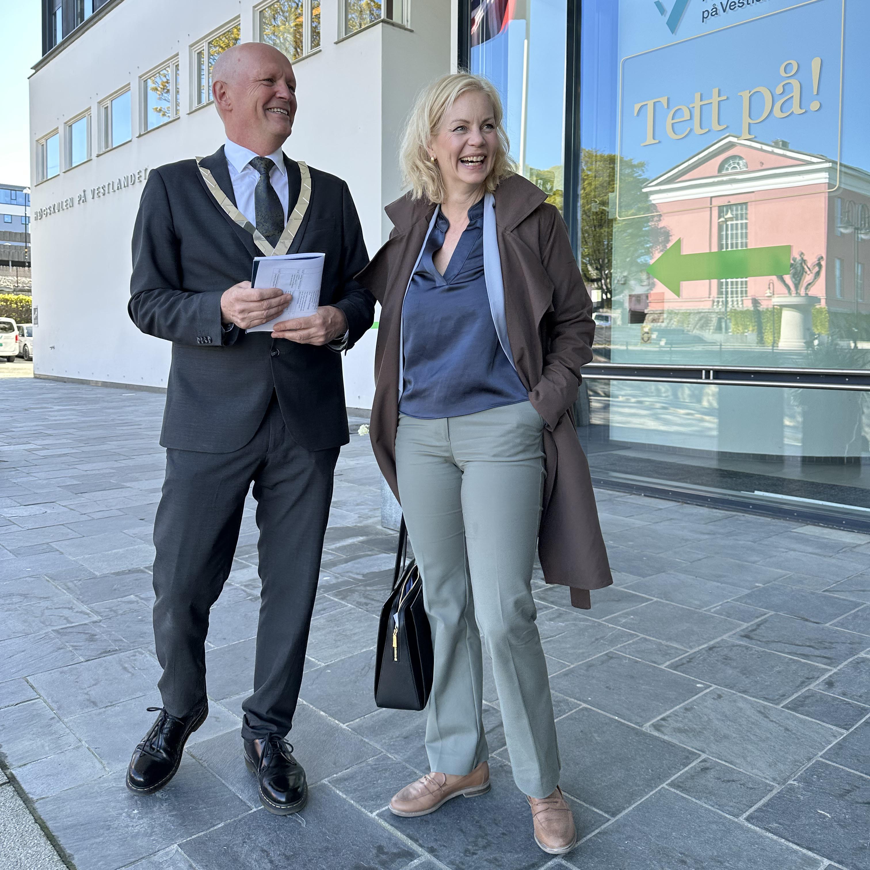 Gunnar Yttri tok i mot statsråd for forsking og høgare utdanning, Sigrun Aasland, på føremiddagen. Gjennom dagen hadde han og HVL-leiinga møter med Aasland og hennar følgje.