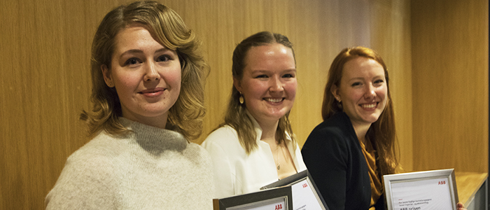 ABB deler ut ein pris til studentar som har vist spesiell god innsikt og evne til problemløysing innan elektro, maskin eller IT. Årets vinnarar var Åse Venke Hodnefjell, Line Hølleland og Kristine F. Roald frå Produksjonsteknikk, som hadde skrive oppgåva «Uncertainty Analysis of Field Kelvin Probe», i samarbeid med Christian Michelsen Research.