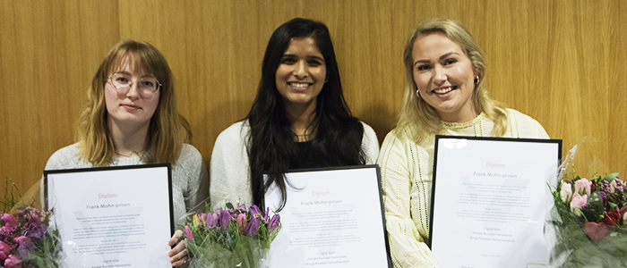 Frank Mohn AS deler kvart år ut ein pris til studentar som har vist spesielt god innsikt og evne til kreativitet. Årets prisvinnarar var trioen Sigrid Isdal, Amalie Korsmo Hammeren og Kiruja Kandiah Ramachandran frå Institutt for Bio- og kjemifag (IBK). Dei hadde skrive oppgåva «Etablering av molekylærpatologiske teknikker for karakterisering av kromosomalt rearrangement i leukemiceller og muskelprotein i vev fra levende/død». Dei tre studentane har mellom anna vore involvert i utviklinga av eit nytt laboratoriekurs i patologi ved HVL.