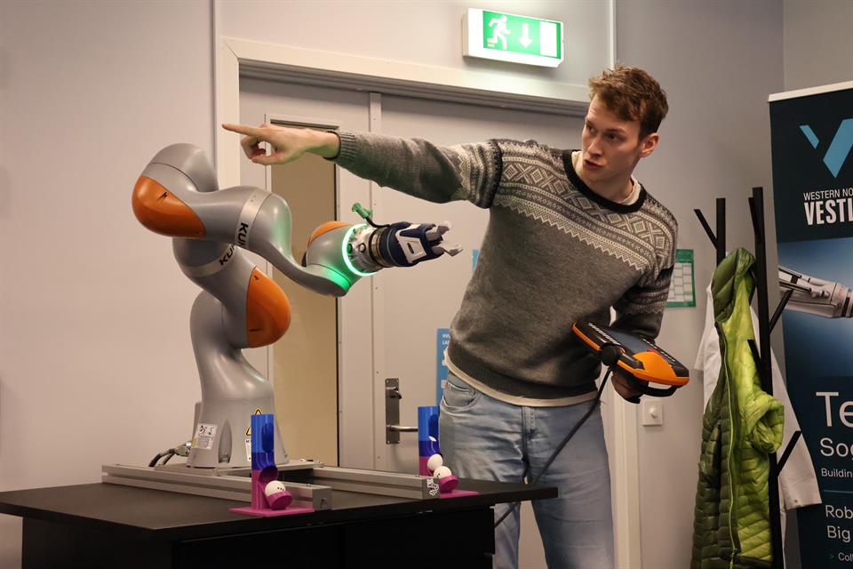 Besøket blei avslutta med ein presentasjon av Jobjørn Myen. Han studerer informasjonsteknologi ved HVL og fekk vist korleis dei mjuke og vennlege robotane er spesialdesigna for å kunne samarbeide med menneske.